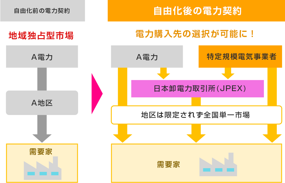 電力自由化以前は地域独占型市場を形成しており、需要家は電力購入について選択の余地はありませんでした。